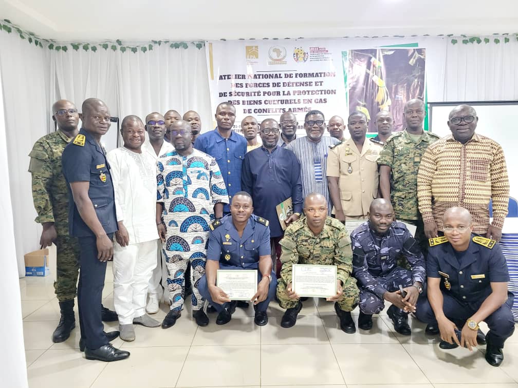 L’objectif visé par cet atelier national est de former ces derniers afin qu’elles soient capables, sur les fronts de guerre, de préserver/protéger les biens culturels contre les trafics et vandalismes. Il s’agit spécifiquement de : former et sensibiliser les forces de défense en phase de regroupement préparatoire pour les missions de maintien de la paix ou d’interposition sur l’importance du patrimoine culturel ; apporter aux forces de sécurité les outils nécessaires à l’indentification des objets et éléments du patrimoine culturel dans le cadre de leur fonction lors des contrôles de routine. Une quinzaine de participants venant de toutes les unités et des six régions administratives du territoire national ont été outillés afin de dispenser ce type de formation à leurs collègues dans ces différentes unités et régions.